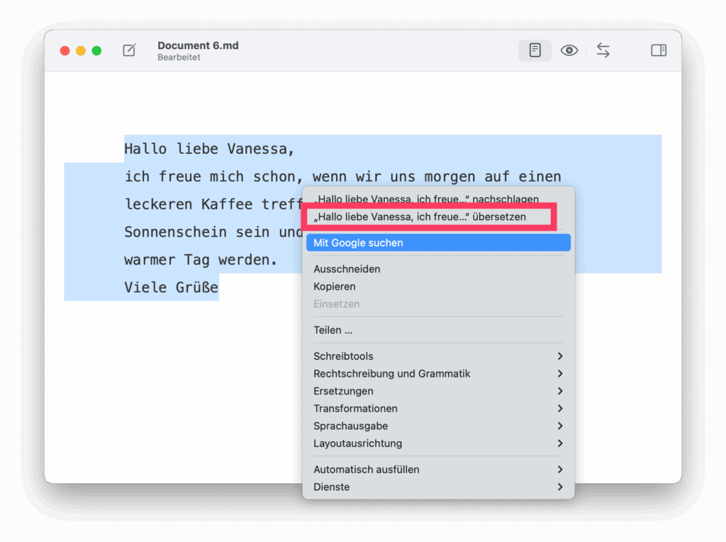 Markieren Sie nun den Text. Dafür gibt es mehrere Möglichkeiten. Am schnellsten markieren Sie den gesamten Text auf einmal mit der Tastenkombination ⌘ + A. Möchten Sie hingegen nur einen bestimmten Abschnitt übersetzen, können Sie ihn einfach mit der Maus auswählen: Halten Sie dazu die linke Maustaste gedrückt und streichen Sie über den gewünschten Textbereich.